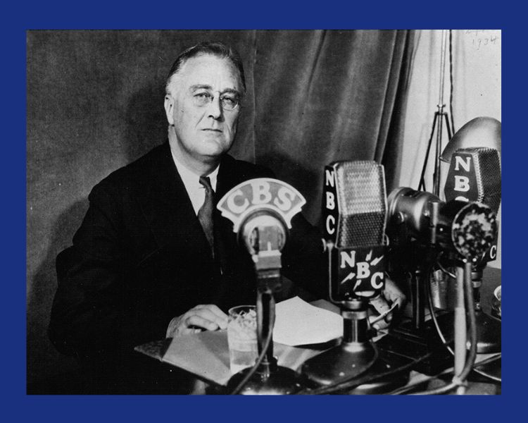 Franklin Delano Roosevelt came into peoples homes during World War II with his fireside radio chats. On December 9th, 1941 he explained declaring war and the ramifications on the military and the the families. The exhibition showcases our large floor radio.