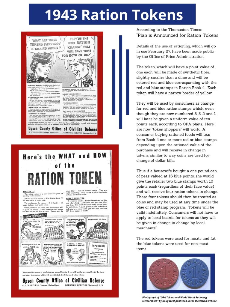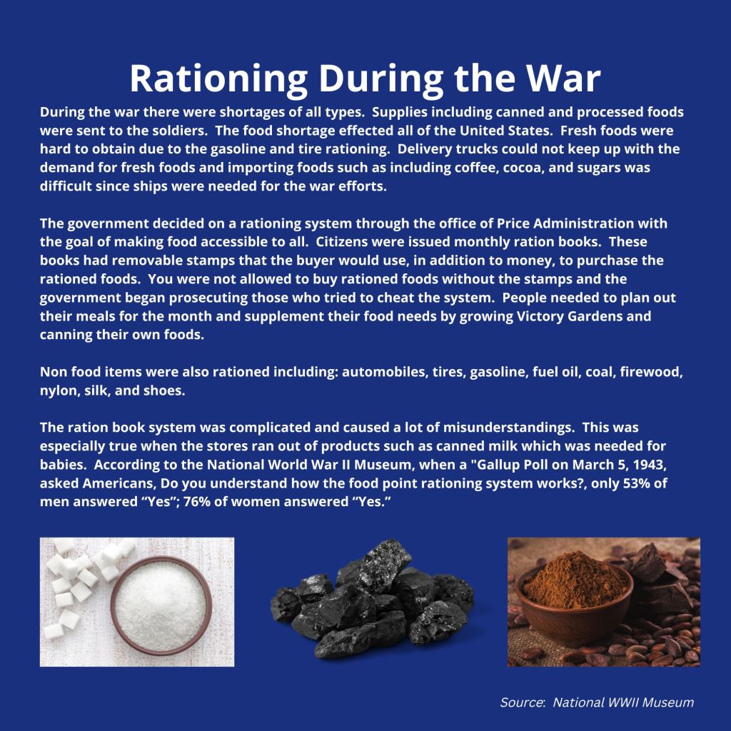 Exhibitions WWII Rationing Posted by Cindy Bowden on April 13, 2023May 26, 2023 Not only was food rationed but prices for the food, by brand, were also capped. The prices and brands were changed on a regular basis, making it difficult for the grocers as well as the consumers. Share this: Share on X (Opens in new window) X Share on Facebook (Opens in new window) Facebook Like Loading...
