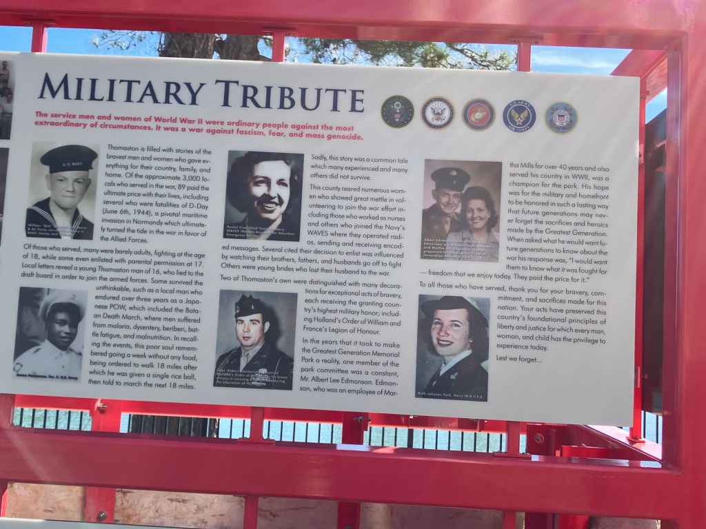 Description: The park is currently open. The Greatest Generation Memorial Park added a new area dedicated to Thomaston’s contribution to WWII.